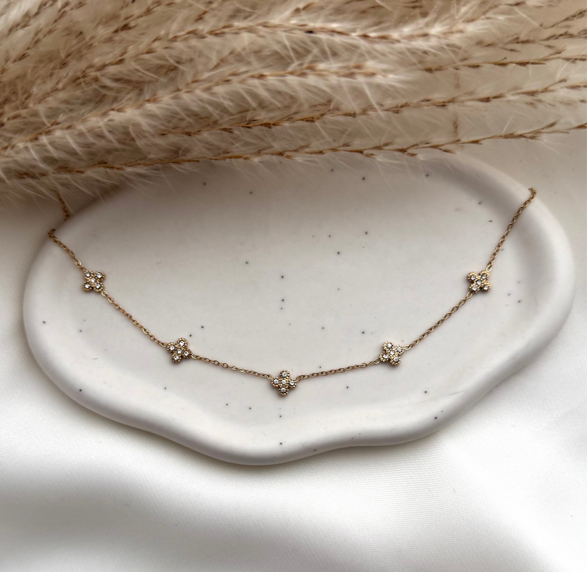 Halskette Fiona besteht aus Edelstahl und ist mit funkelnden Zirkon Steinchen besetzt.